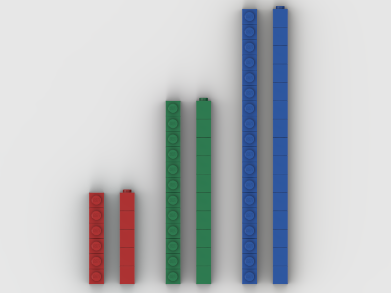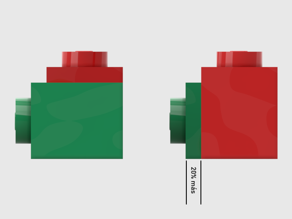 Ya que el alto es mayor que el lado, un brick colocado en horizontal (el stud hacia un lado) cubre más longitud que un brick colocado en vertical (de pie, con el stud hacia arriba): un 20% más1Los 9.6 mm de altura del brick no tienen en cuenta los 1.6 mm de altura del stud, ya que este quedaría oculto al poner otra pieza encima. Tampoco los 0.1 mm adicionales debidos a la palabra LEGO grabada en relieve en el stud..