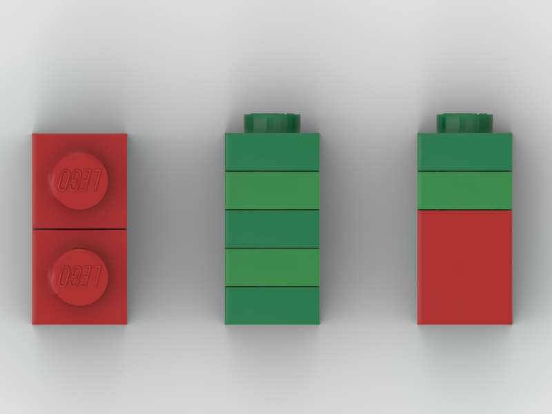 Recordemos de la entrada dedicada a los plates que un plate mide 3.2 mm de altura. Un brick 1×1 mide 8 mm de lado y 9.6 mm de altura. Si empleamos la altura del plate –en adelante hablaré de plate a secas– como unidad de medida2Siguiendo el ejemplo de Deepak Shenoy, un brick 1×1 mide [math]\frac{8}{3.2} = 2.5[/math] plates de lado y [math]\frac{9.6}{3.2} = 3[/math] plates de altura.